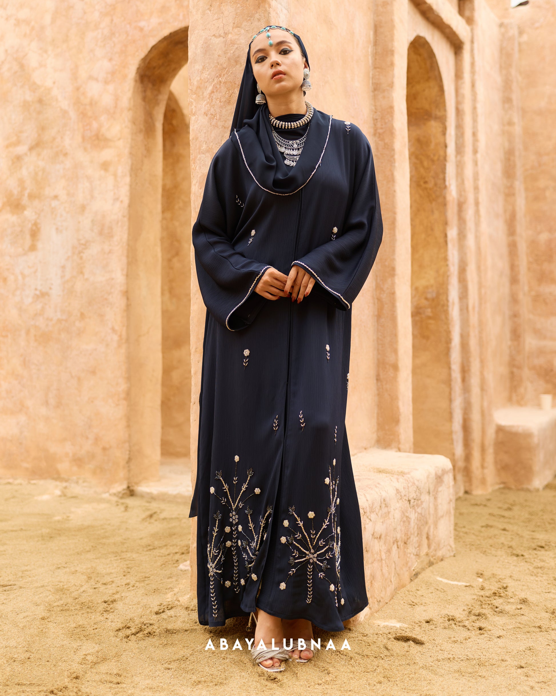 A gorgeous design offering comfort and sophistication, Hanan doesn’t shy away from glitter. A scatter of floral beading adorn the abaya with luminous pearls and sparkling lunettes forming lavish bouquets on the hem.