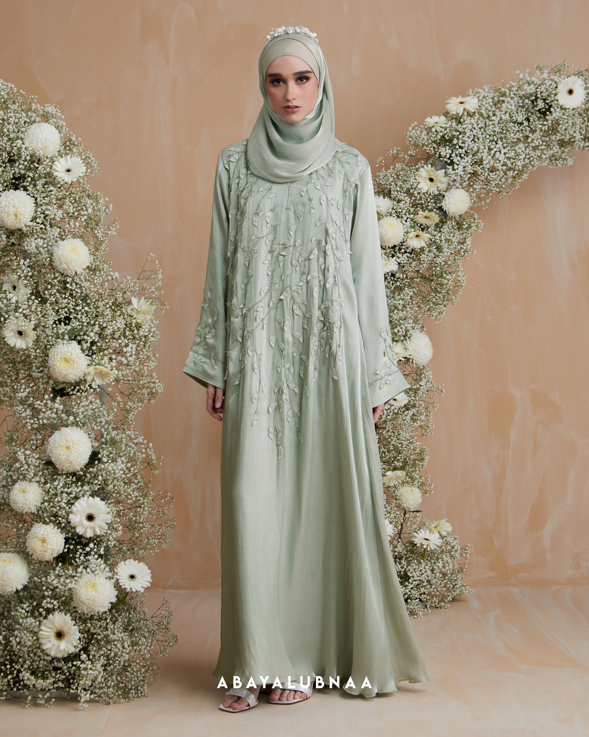 Floral appliques and threaded embroidery add depths and textures, creating a multidimensional essence in the most tasteful and sophisticated way.