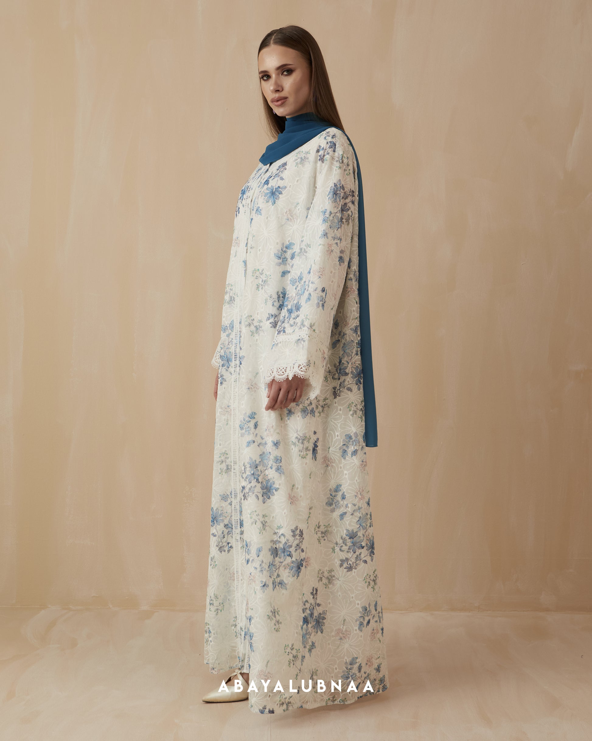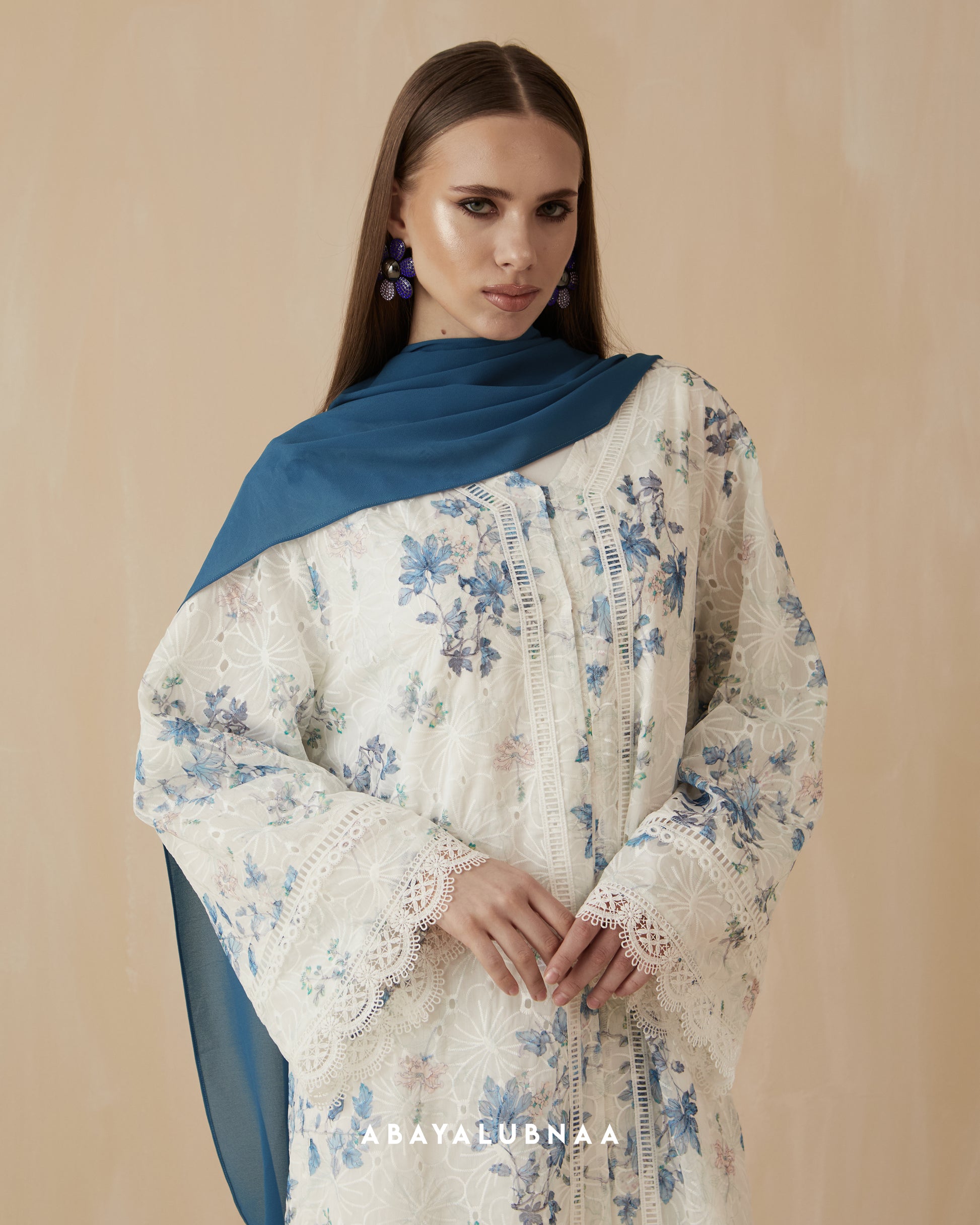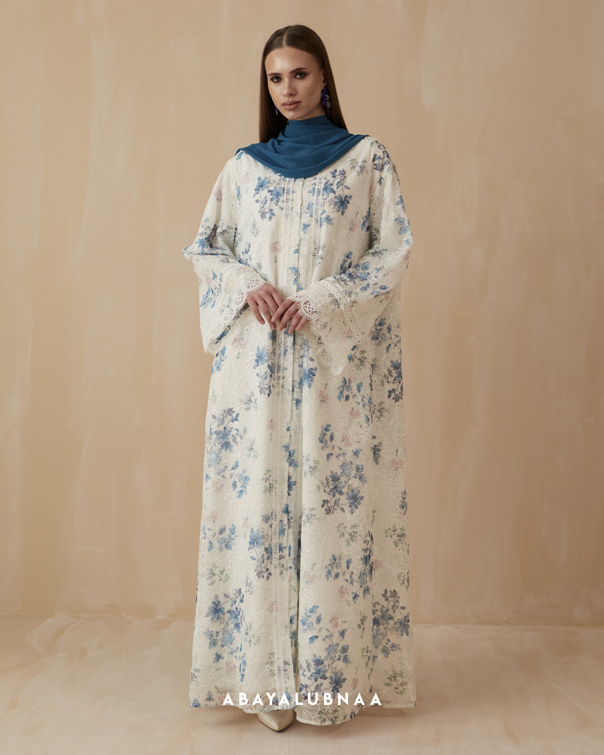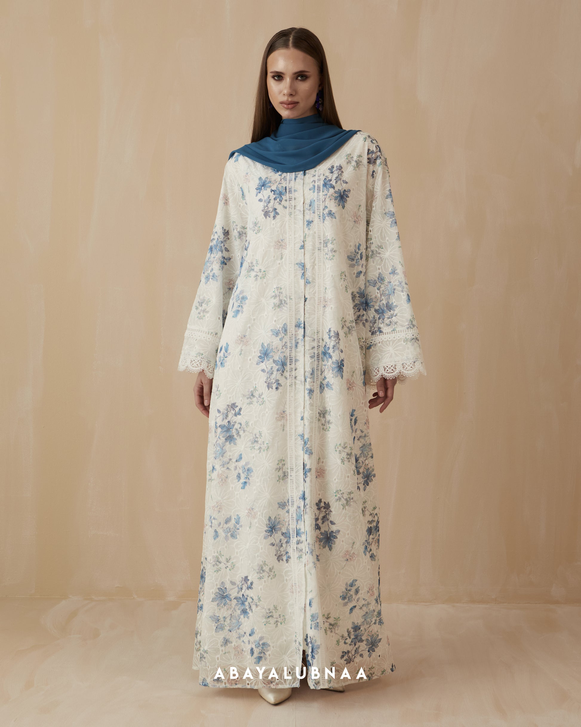 Embroidered florals over a nature inspired print gives Izara tons of character so it will look great even with minimal styling. Trimmed with eyelet lace, scalloped edges frame the cuffs, while a more geometric pattern line up the panels on the front of the abaya.