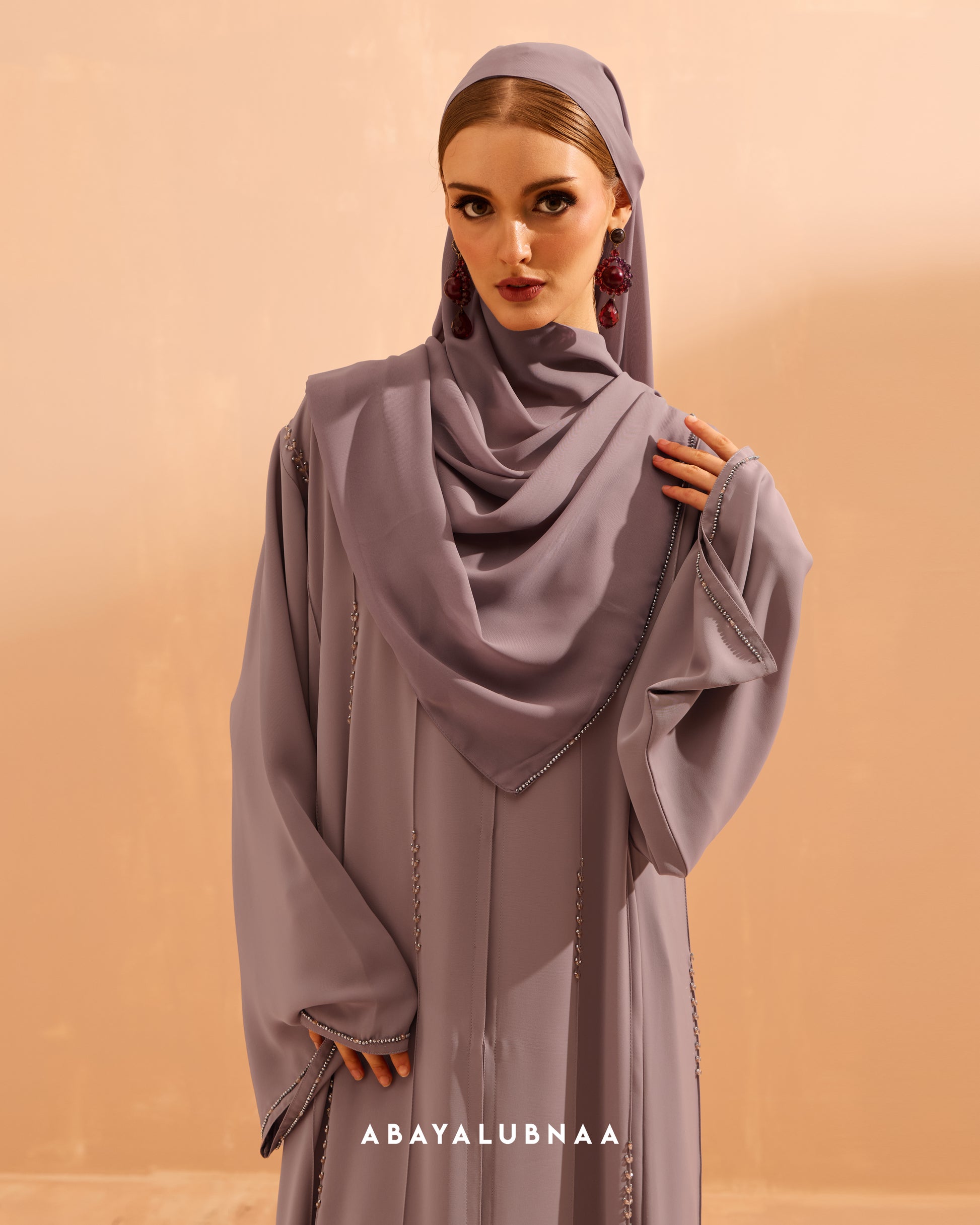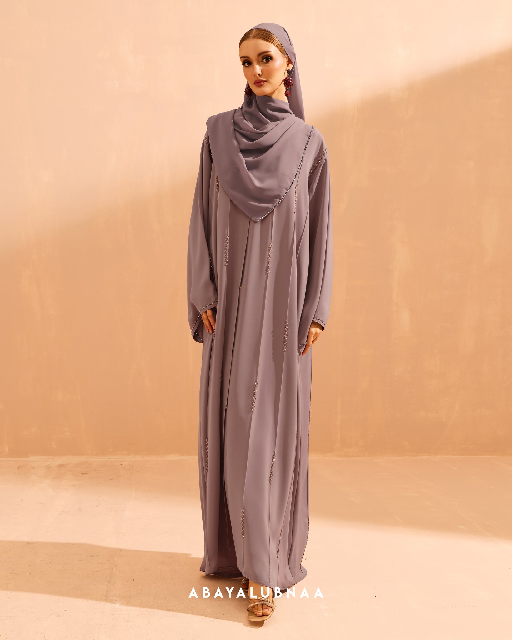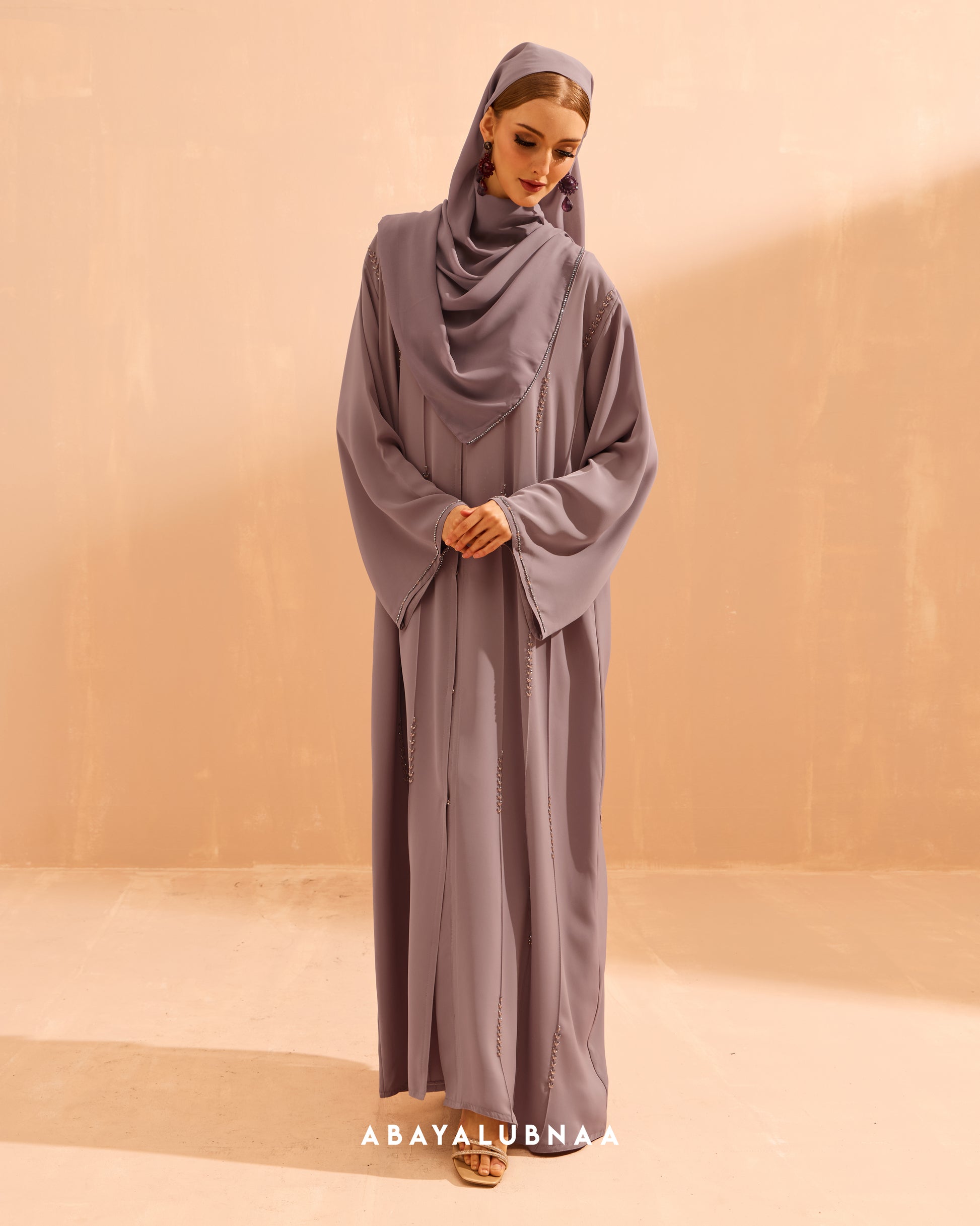 A structured open-type abaya with clean lines of sparkly beads formed in leafy motifs,