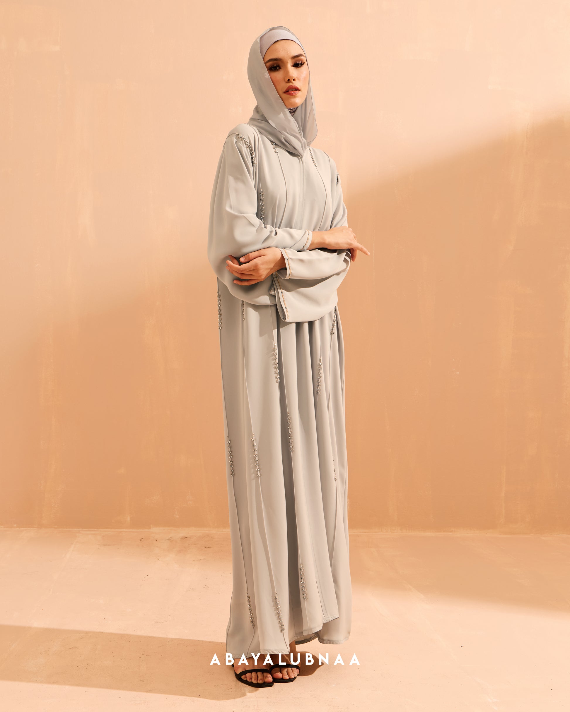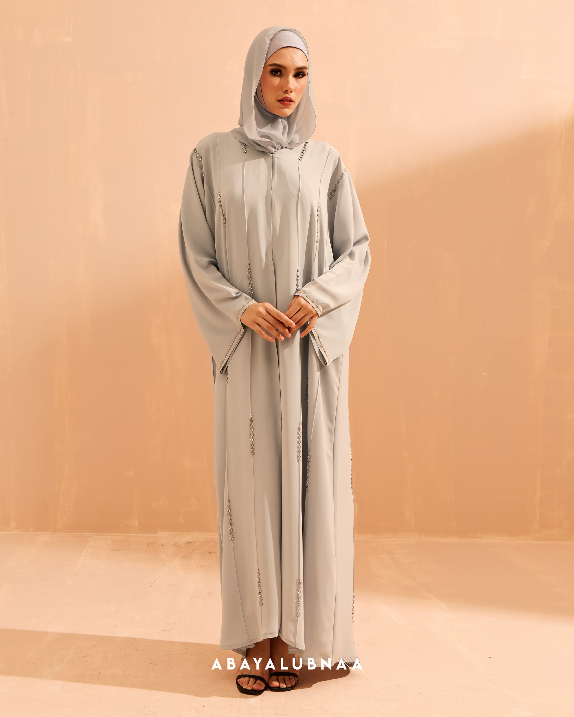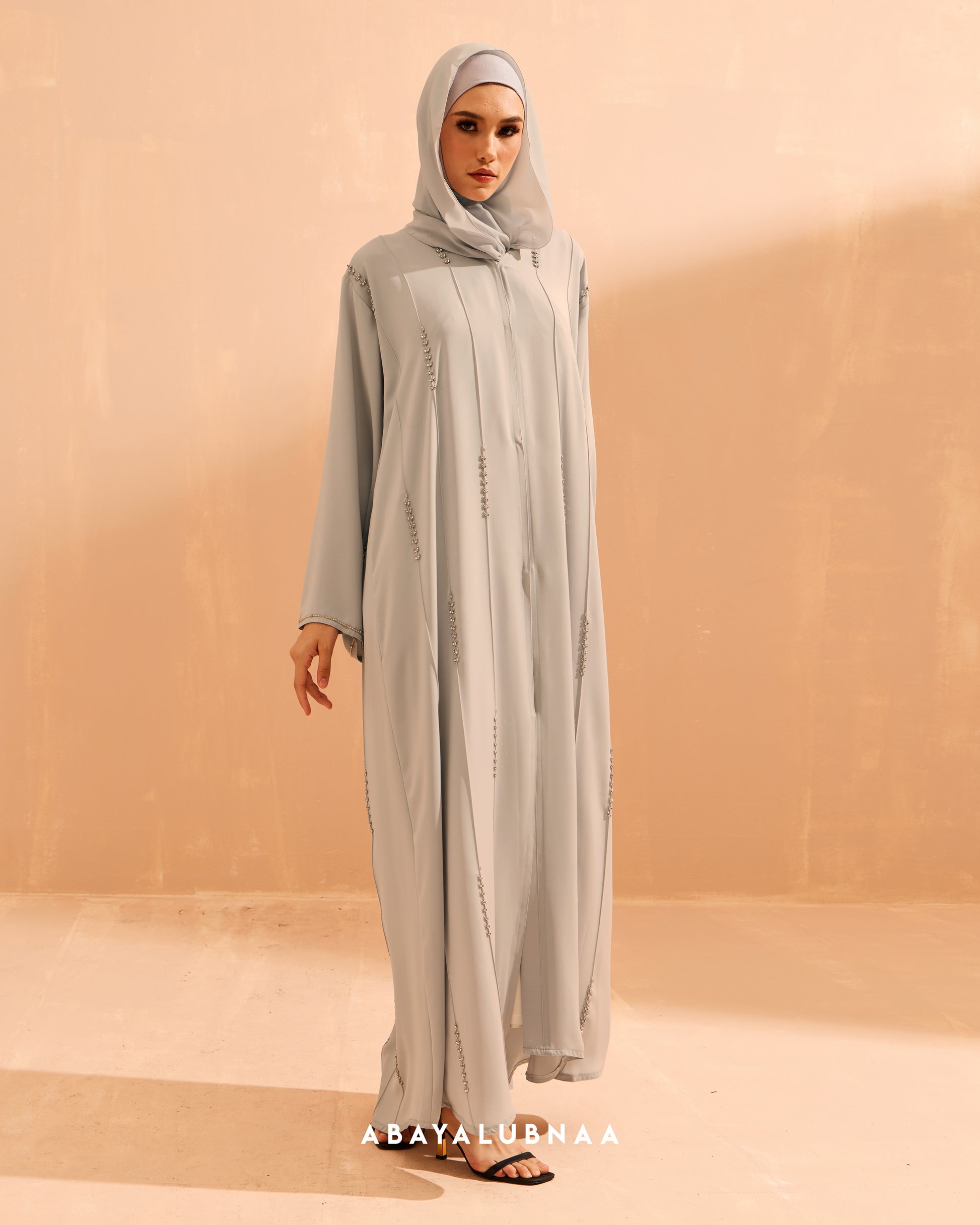 A structured open-type abaya with clean lines of sparkly beads formed in a leafy motifs, Lumina personifies quiet luxury, making its mark through impeccable craftsmanship paired with soft premium fabric.