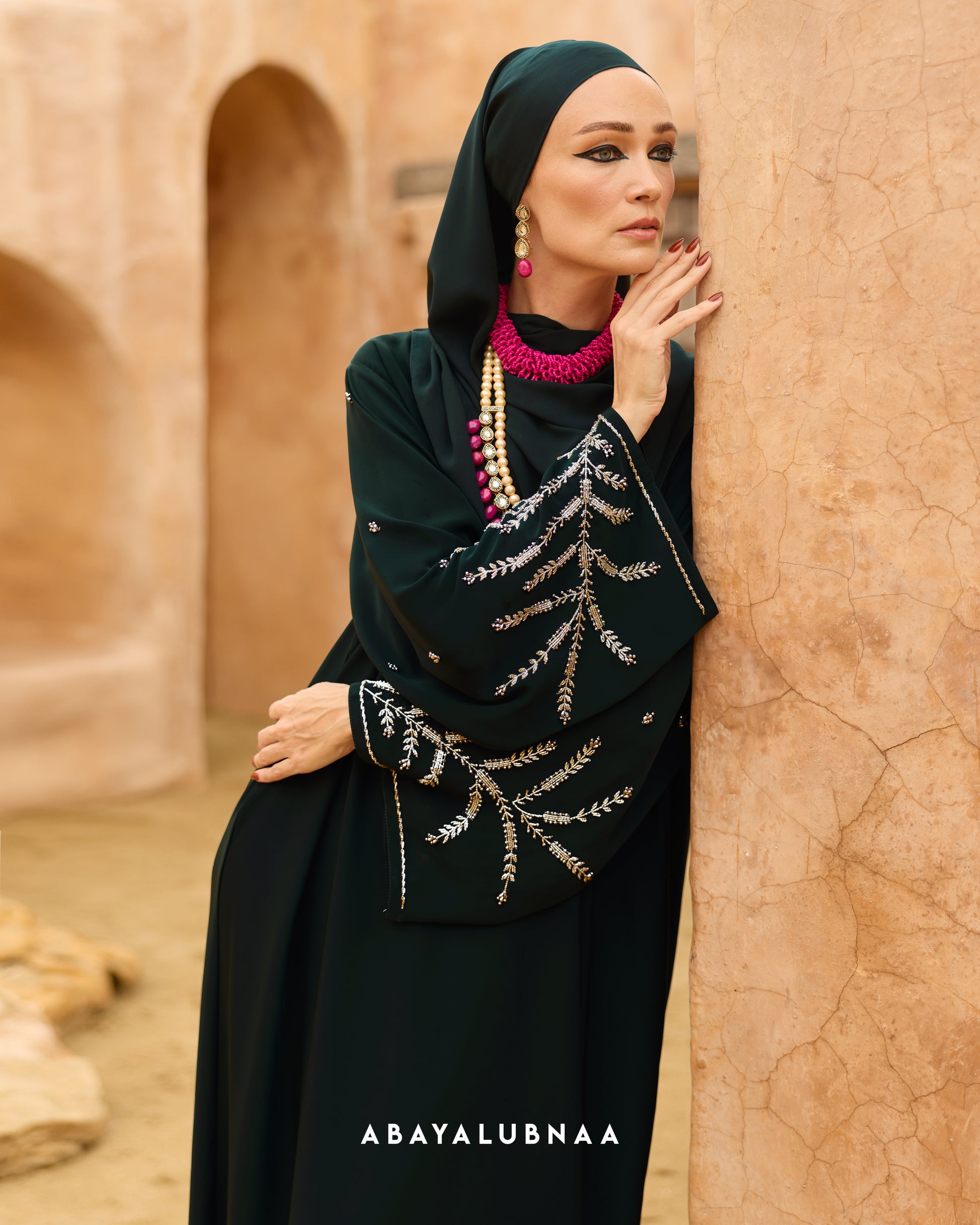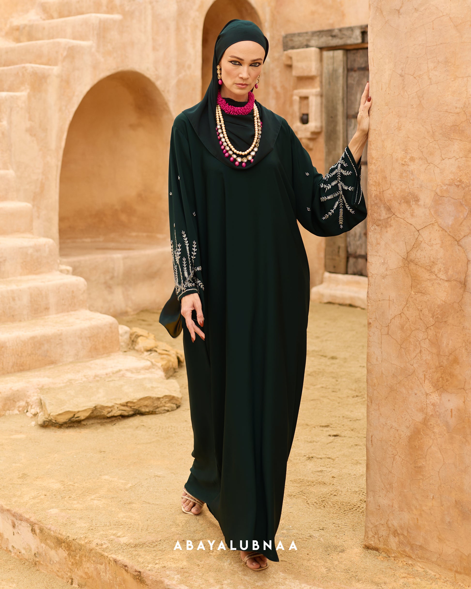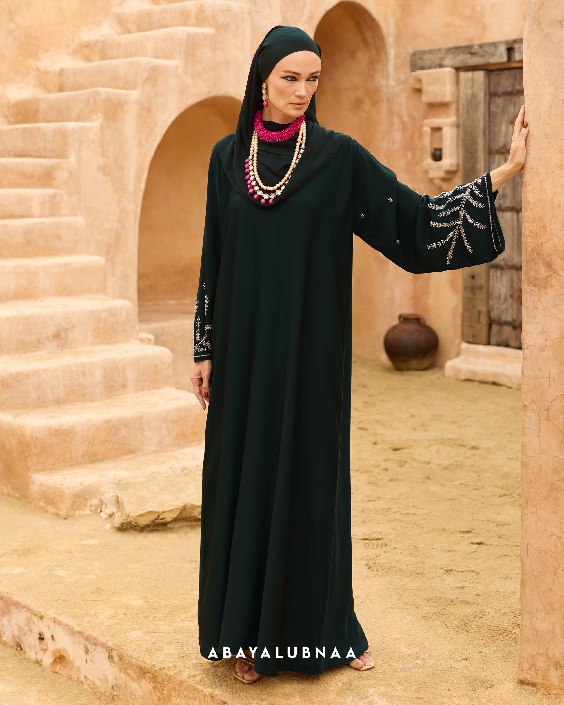 The artfully placed beads take on an ethereal beauty in soft lighting, catching each ray to create high-octane glamour in a memorable look that will garner admiration. Best for evening outings, Nora is a stunning choice for an Iftar event or a fancy Raya do.