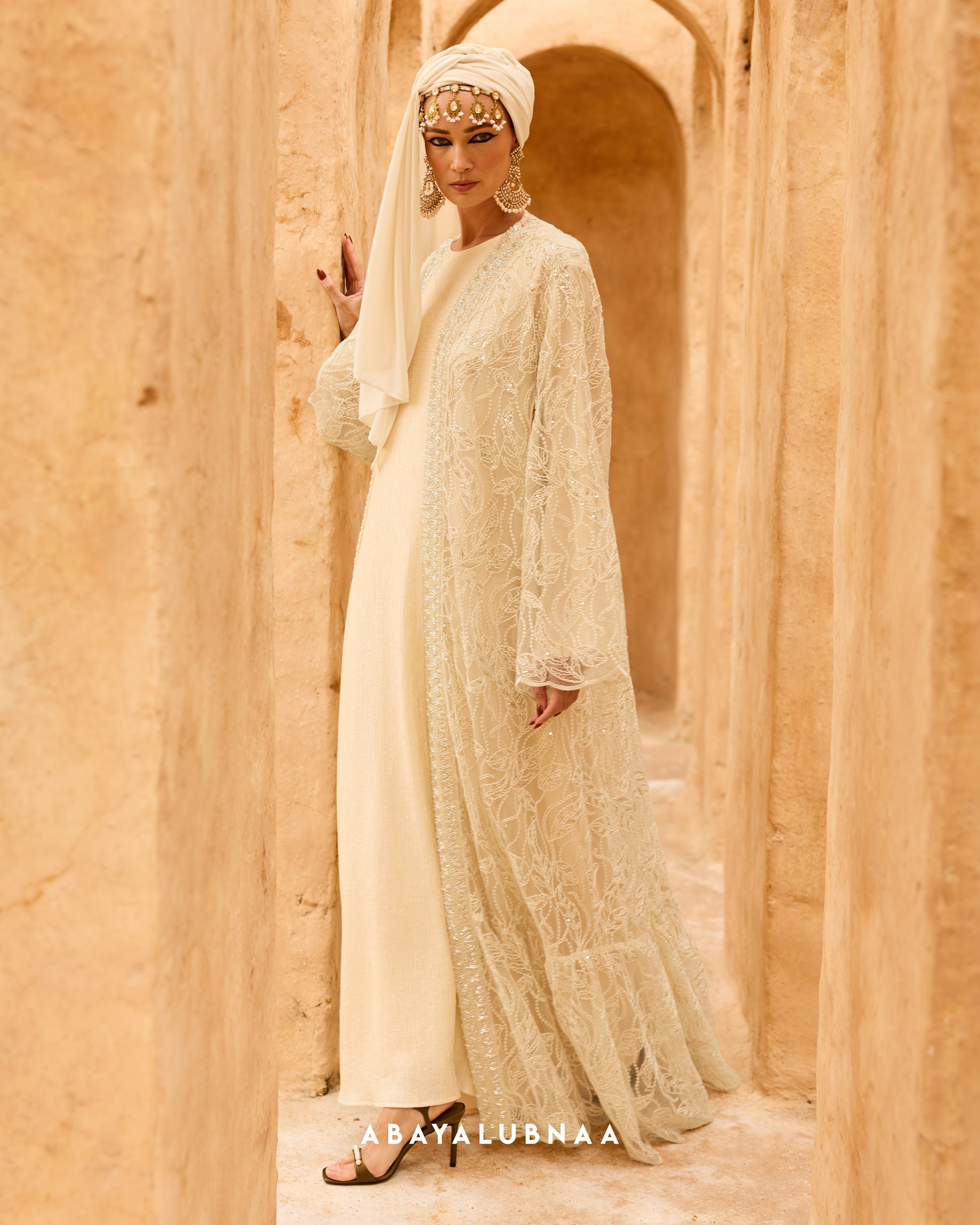 A regal look befitting its name, Sultana is an impeccable design that blends intricate craftsmanship with timeless luxury. Delicate embroidery inspired by Moroccan artistry are seen on the front trim of the abaya, placed over lace lavishly filled with lush botanicals that are a nod to the country’s exotic flora.