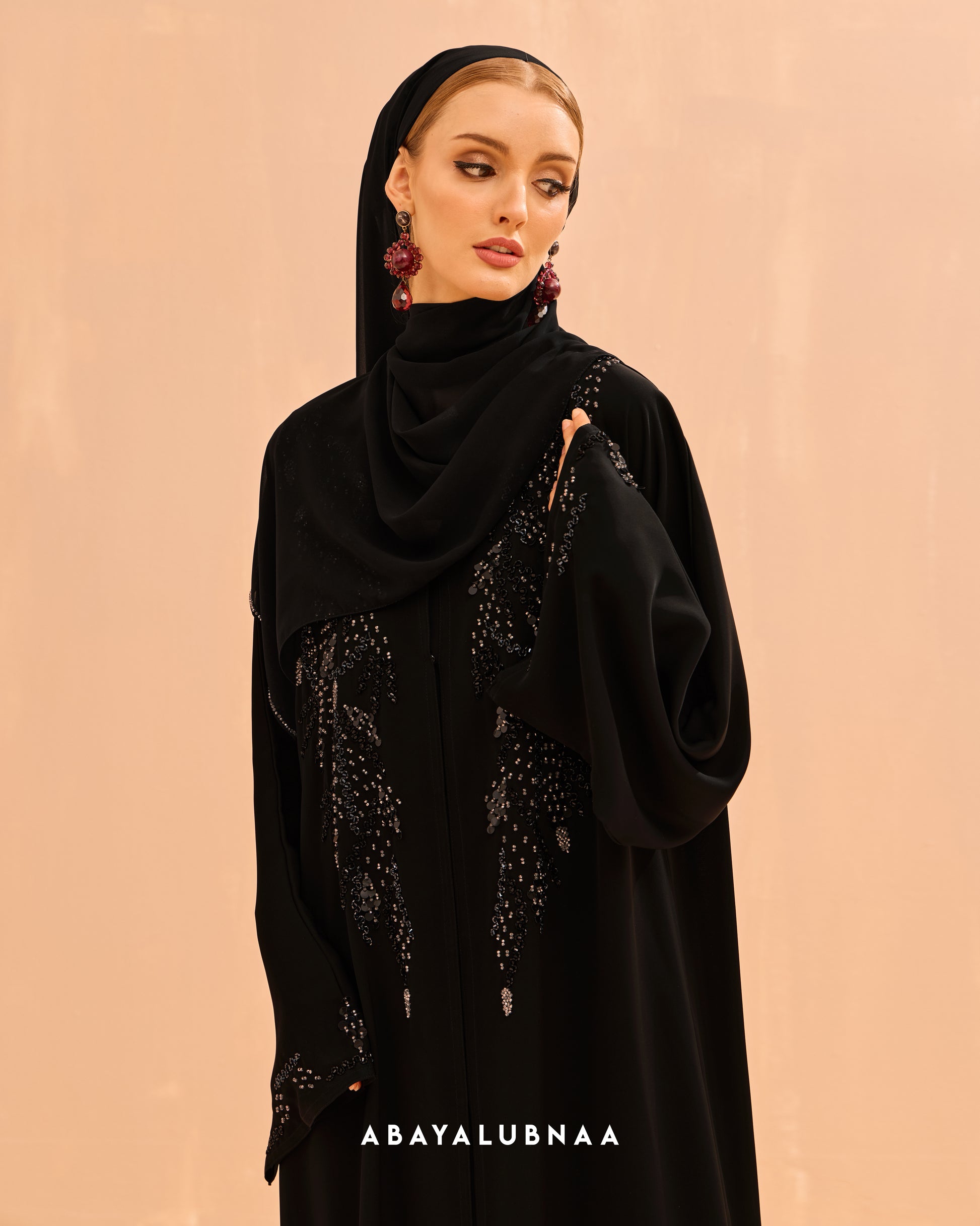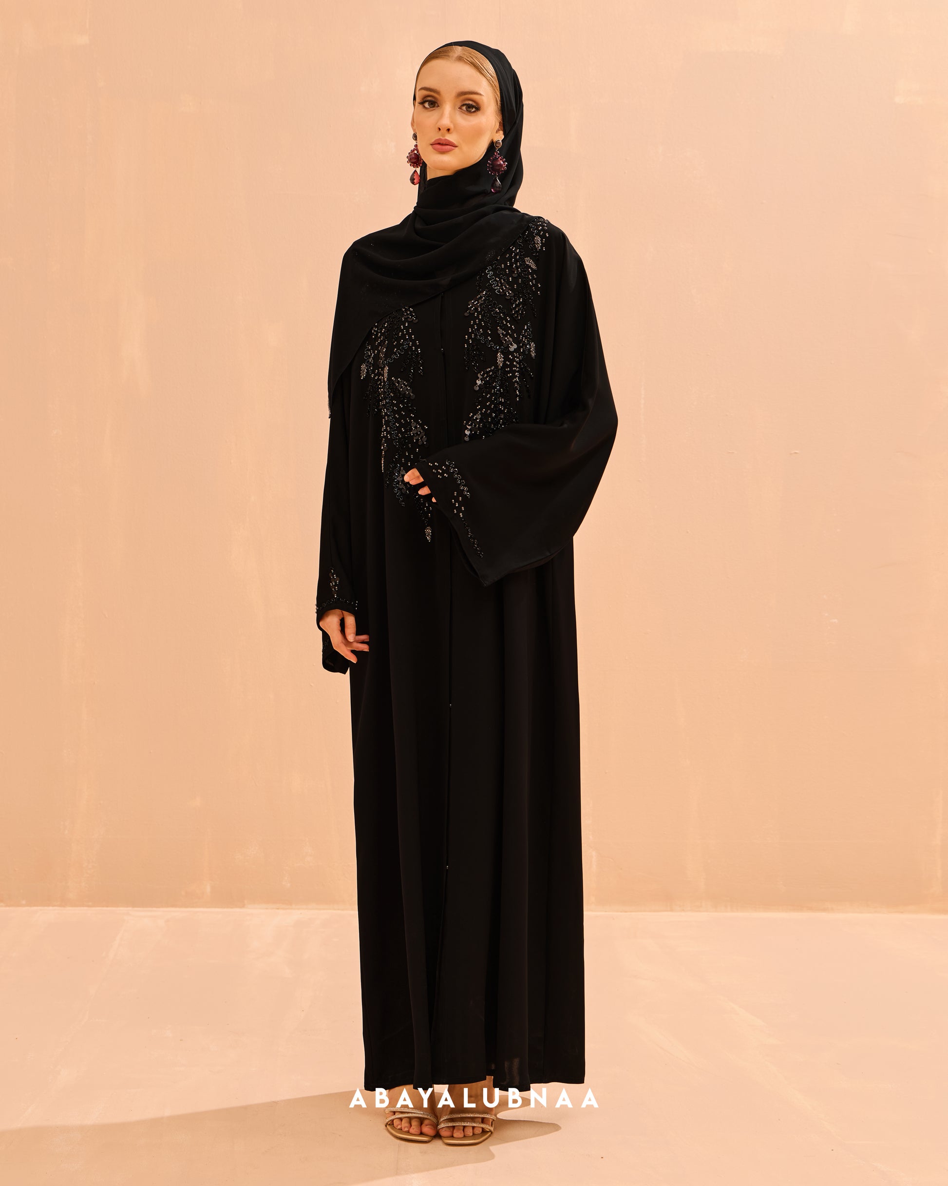 The delicate design on the bodice and sleeves resemble fine vines which mimics Morocco's botanical structures, creating a glamorous and textured look suitable for a celebratory abaya.